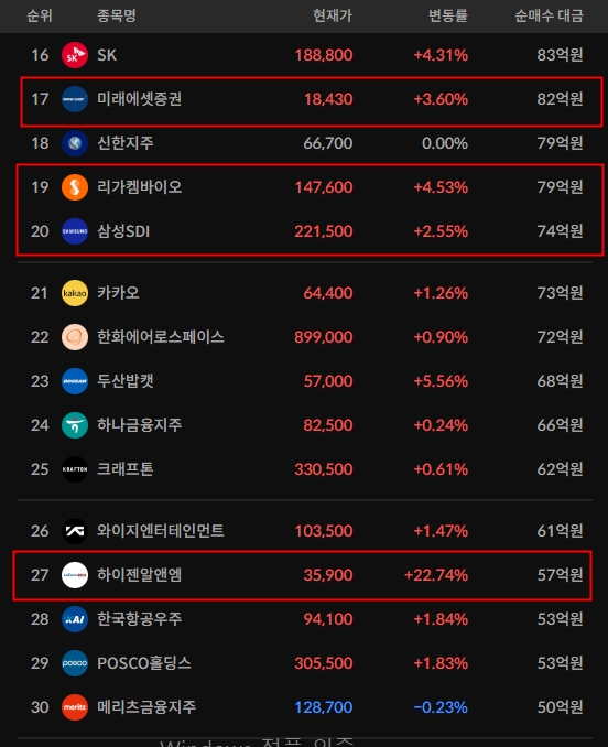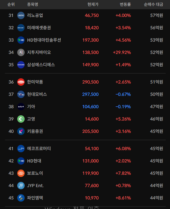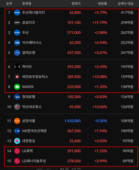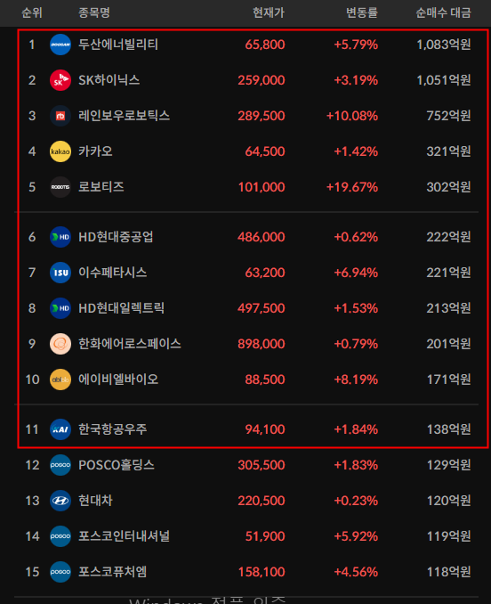 코스피/코스닥 기관 순매수 상위