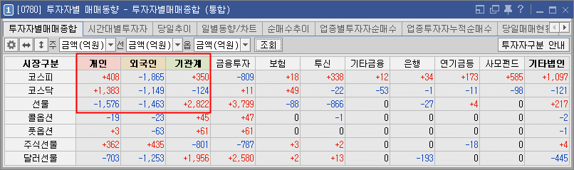 - 오전/오후 동안 개인과 외기관의 수급이 오고갔다.