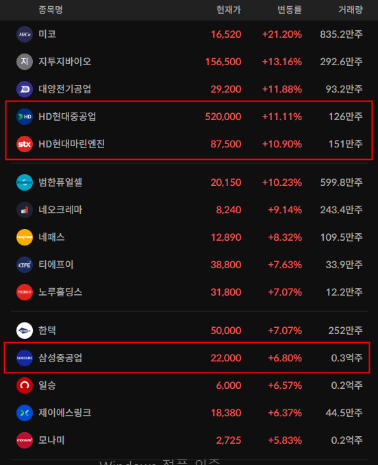 - 언뜻보기에는 조선이 주도섹터로 이끌어간 것으로 보이나, 합병 소식에 개별호재로 상승한 조선주이다.