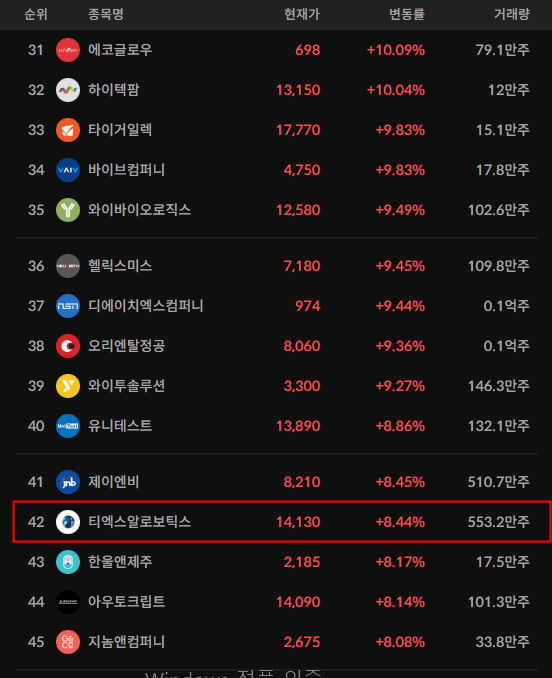 - 특히나 로봇/바이오 섹터와 관련해서 수급이 크게들어오면서 큰 상승을 이끌어간 모습도 보인다.