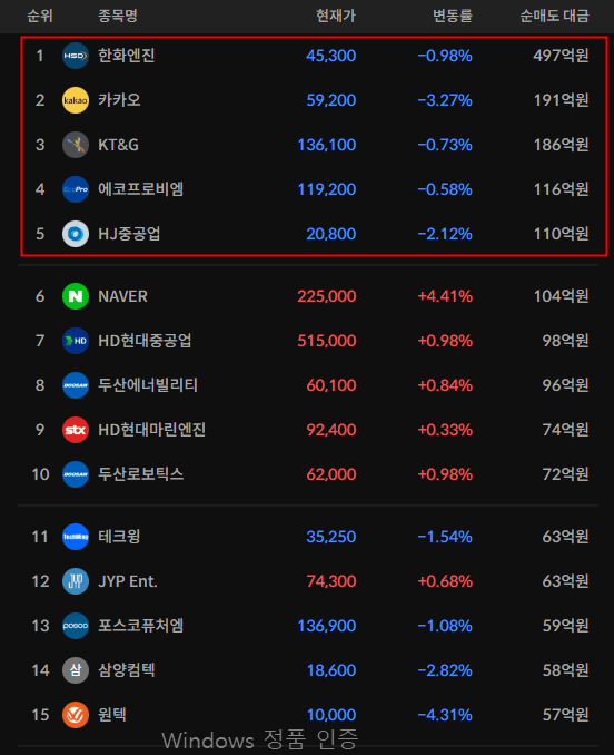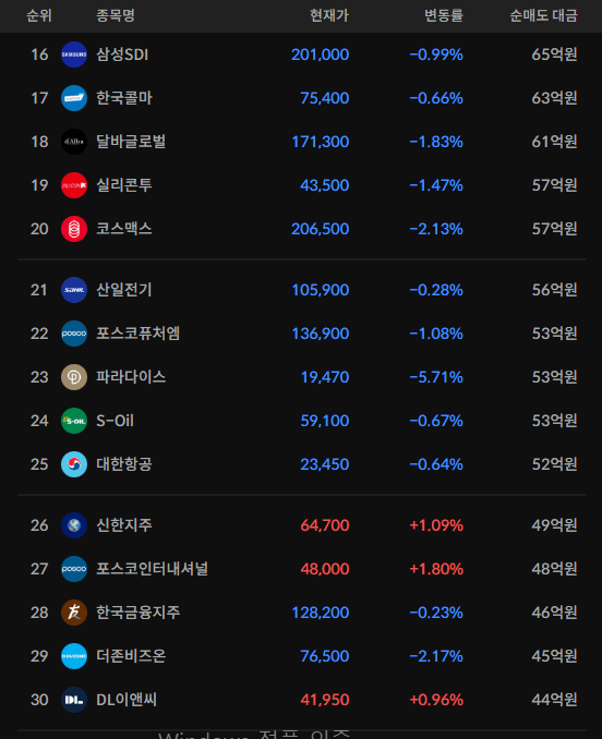 코스피/코스닥 기관 순매도 상위