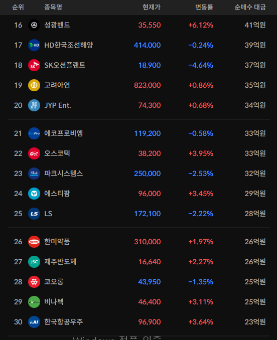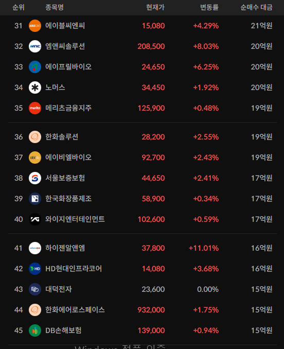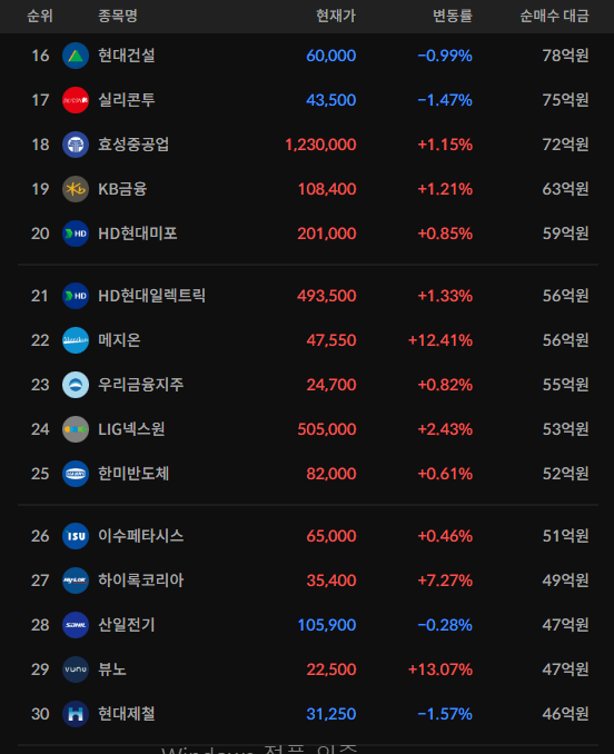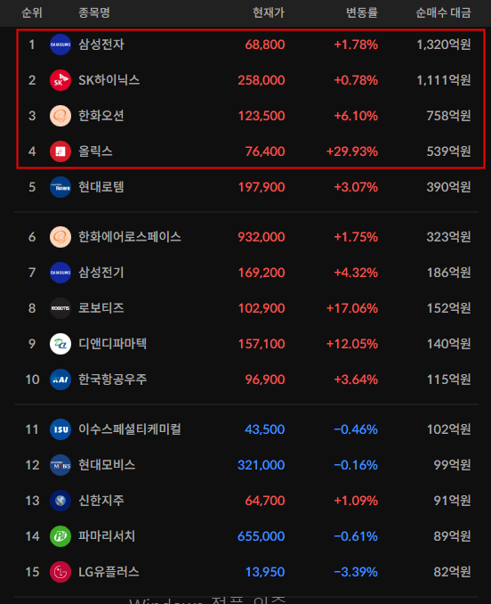 코스피/코스닥 기관 순매수 상위