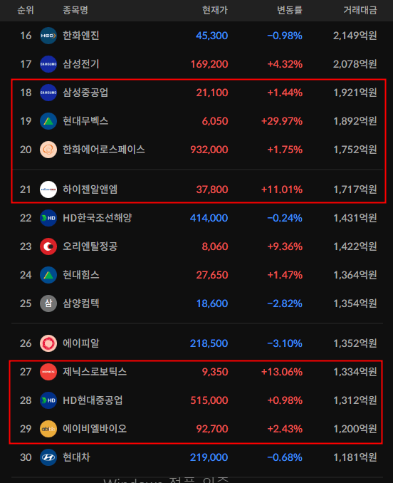 - 크게 거래대금이 터진 종목이 없을진 몰라도, 전반적으로 거래대금이 높은 모습이 보인다.