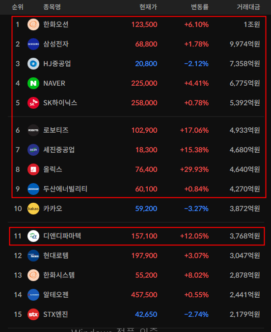 코스피/코스닥 상위 거래대금 종목
