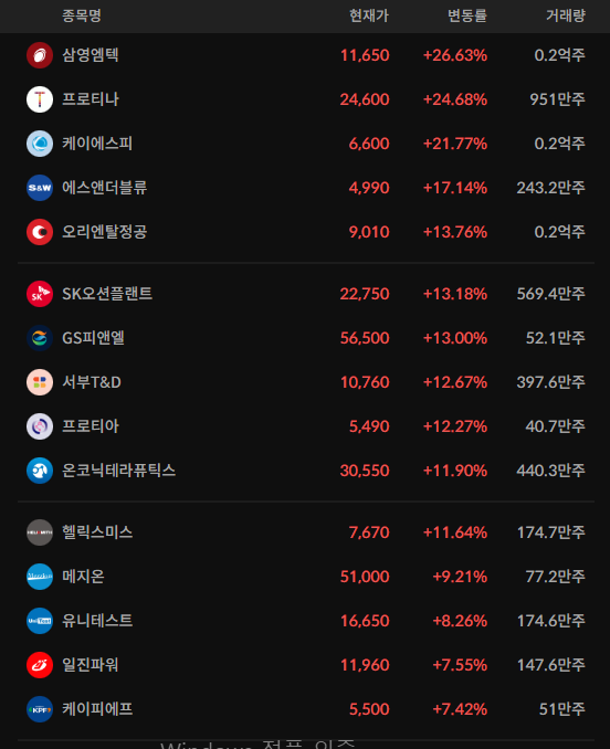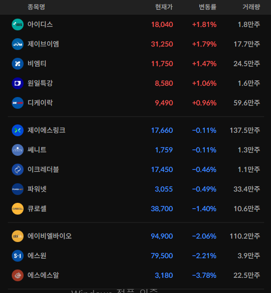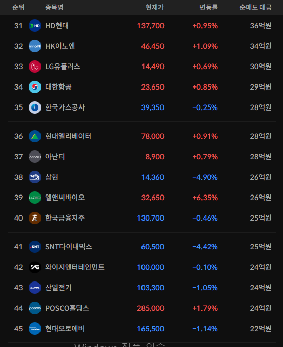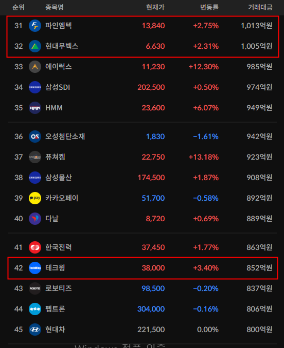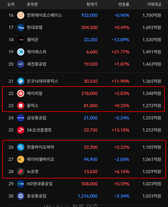 - 거래대금이 크게 터진 종목이랄 것이 없다. 다만, HJ중공업의 상승세가 지속적으로 보인다.