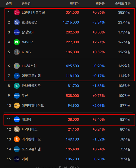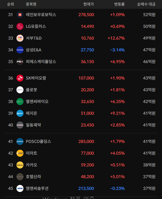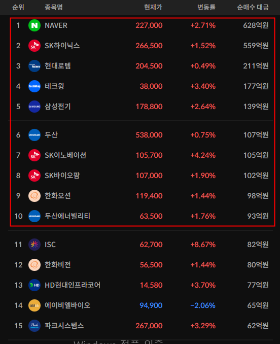 - 연일 외국인의 순매수세가 들어왔으나, 오늘은 크게 들어오지않은 모습이다.