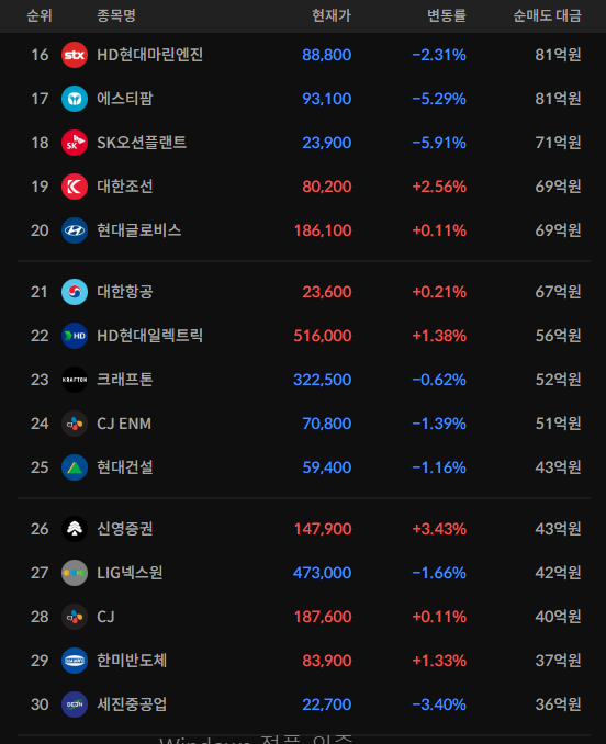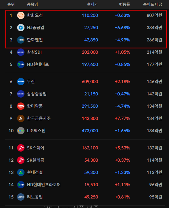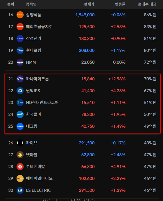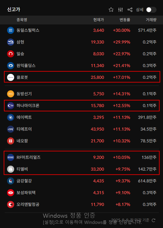 - 동시에 반도체 종목들이 다같이 상승하면서, 기존에 강세였던 종목(HJ중공업/바이오)는 비교적 주춤했다.