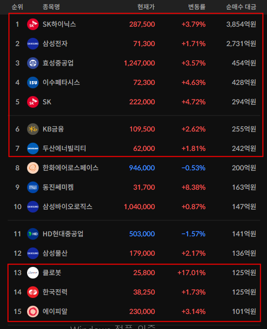- 외국인의 큰 수급이들어오면서 1조 거래대금의 종목이 2개 SK하이닉스/삼성전자로 나타났다.