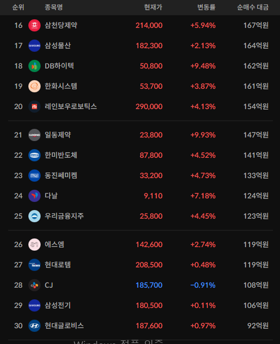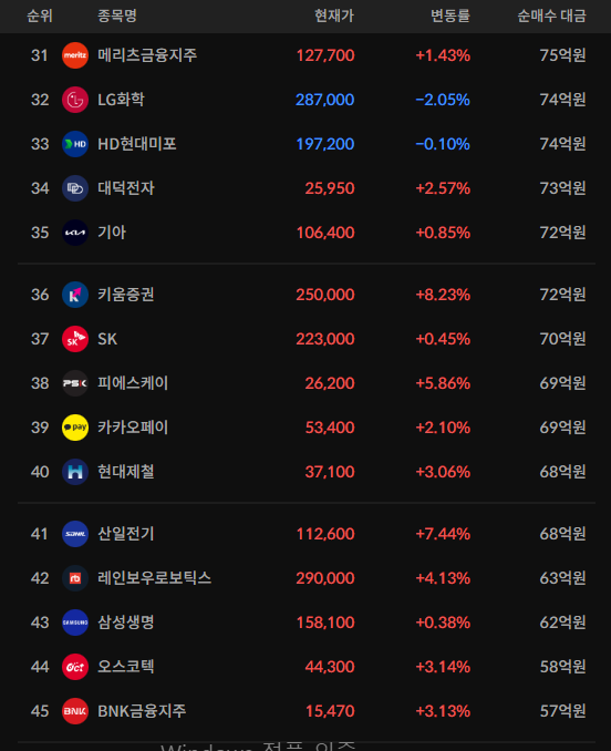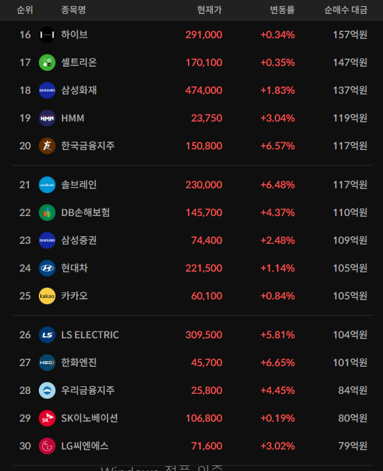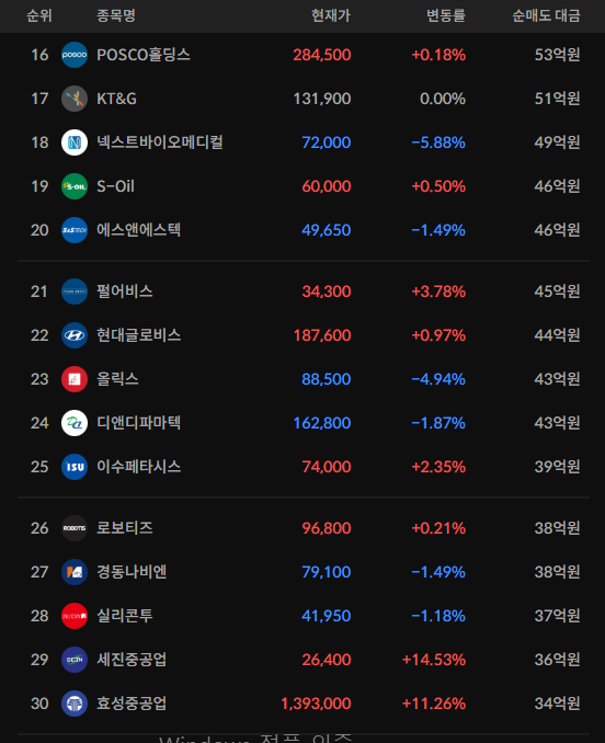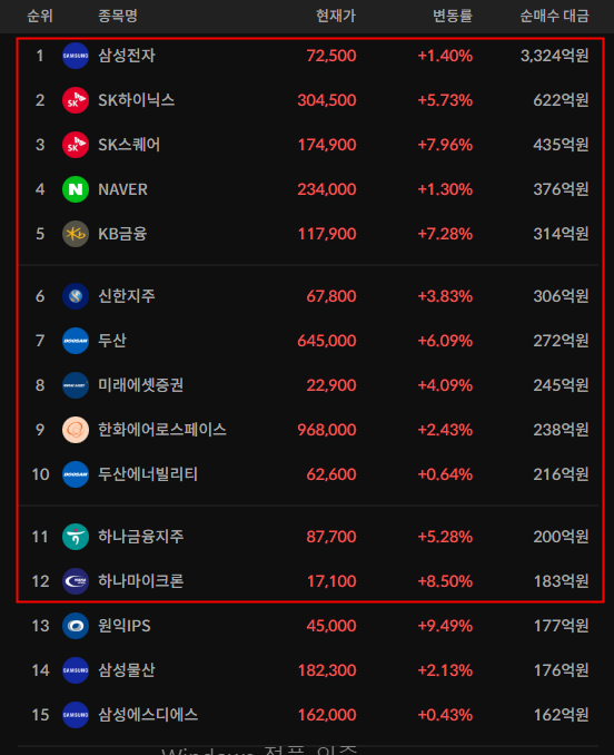 코스피/코스닥 기관 순매수 상위