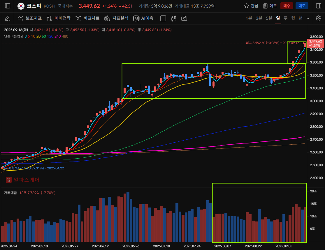 - 박스권에 벗어나서 지속적으로 상승, 3400를 생각보다 강하게돌파하면서, 더 큰 지수로 나아가는 중.