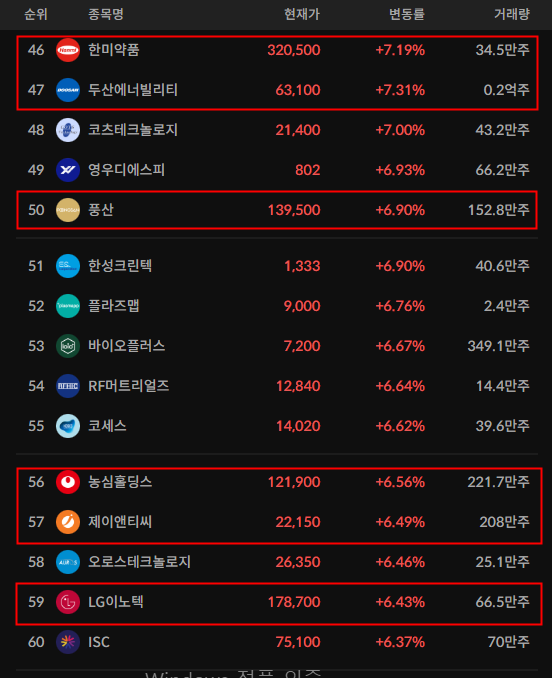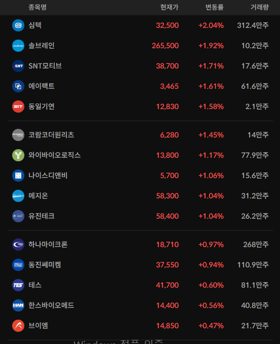 - 상승률이 큰 개별종목들이 많이 보인다. 개별 호재를 통해서 크게 상승한 모습이지만, 섹터를 모두 이끌어가기에는 조금 아쉬운 모습이다. 개별 종목만 상승한 모습들이 나타난다.