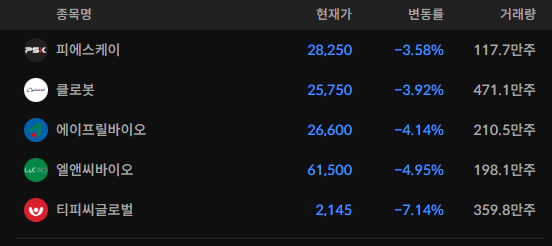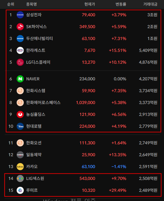 코스피/코스닥 상위 거래대금 종목