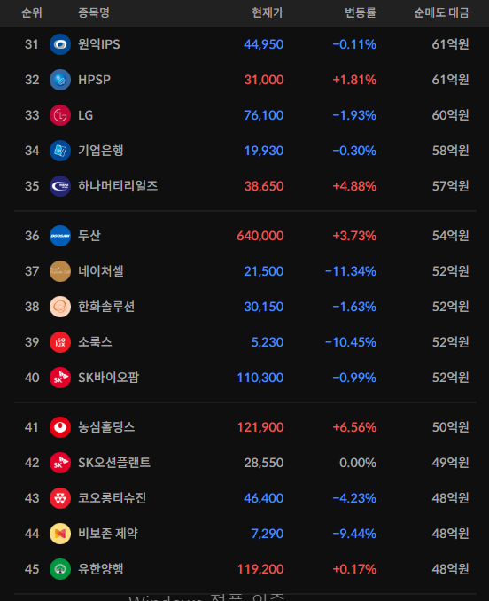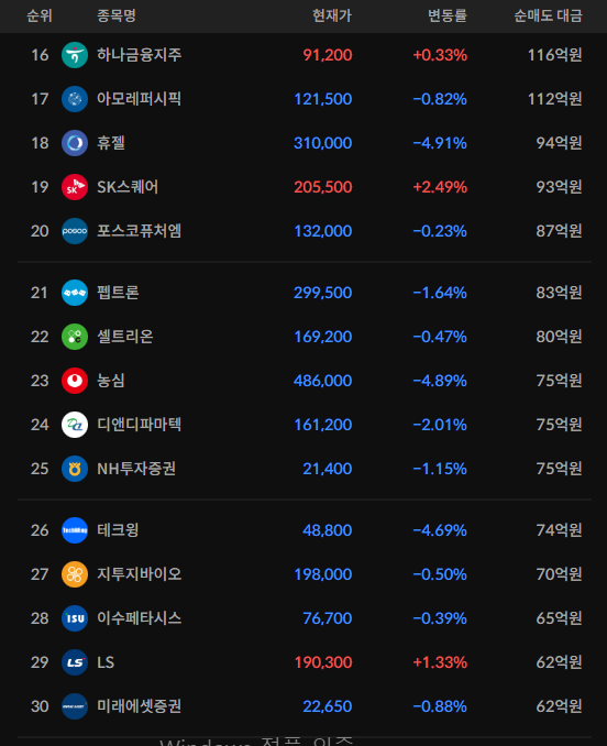 코스피/코스닥 기관 순매도 상위