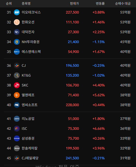 코스피/코스닥 기관 순매수 상위