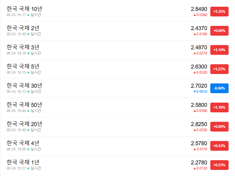 - 금리인하에 대한 기대감보다 경제지표가 발표나기전 경제위기에 대한 우려감인지 국채 수익률이 연일 상승하는 모습
