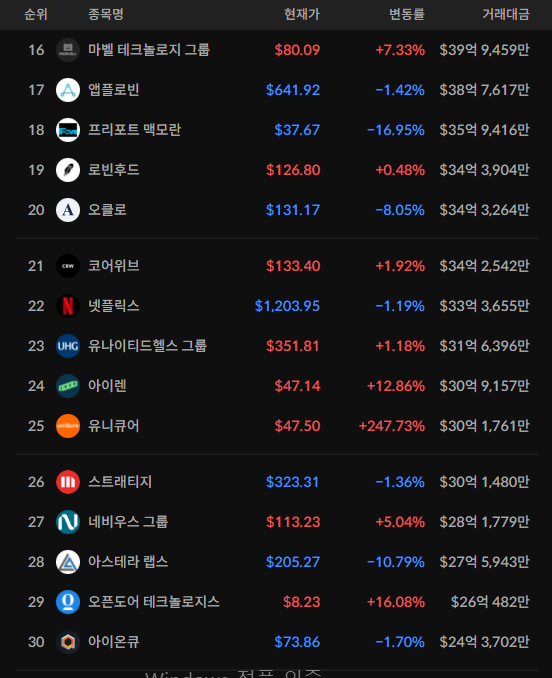미국 상위 거래대금(뉴욕/나스닥)