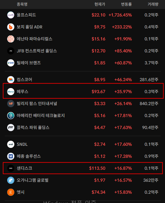 - 메루스는 인수합병으로인해 크게 상승한 모습이다.