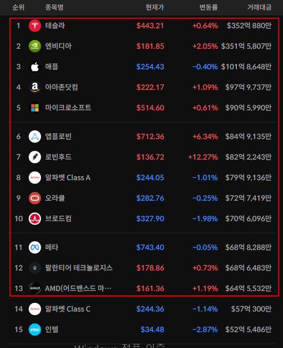 미국 상위 거래대금(뉴욕/나스닥)